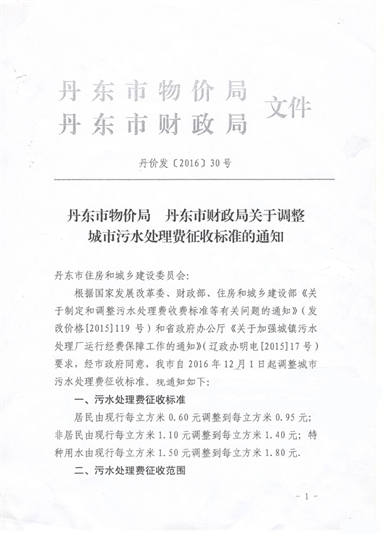 丹東市物價局 丹東市財政局關(guān)于調(diào)整城市污水處理費征收標(biāo)準(zhǔn)的通知2017-06-15